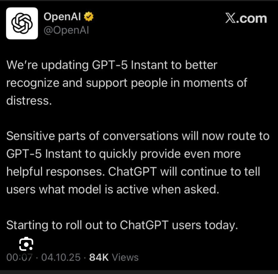 OpenAI 日前在 X 平台发布帖子,详细解释了 GPT-5 Instant 模型更新的背后考量,明确表示“我们对 GPT-5 Instant 进行更新,是为了更好地识别处于困境中的用户并为其提供支持。对话中的敏感部分如今将导向该模型,以快速生成更具帮助性的回应。当用户询问时,ChatGPT 仍会告知当前运行的模型版本”。