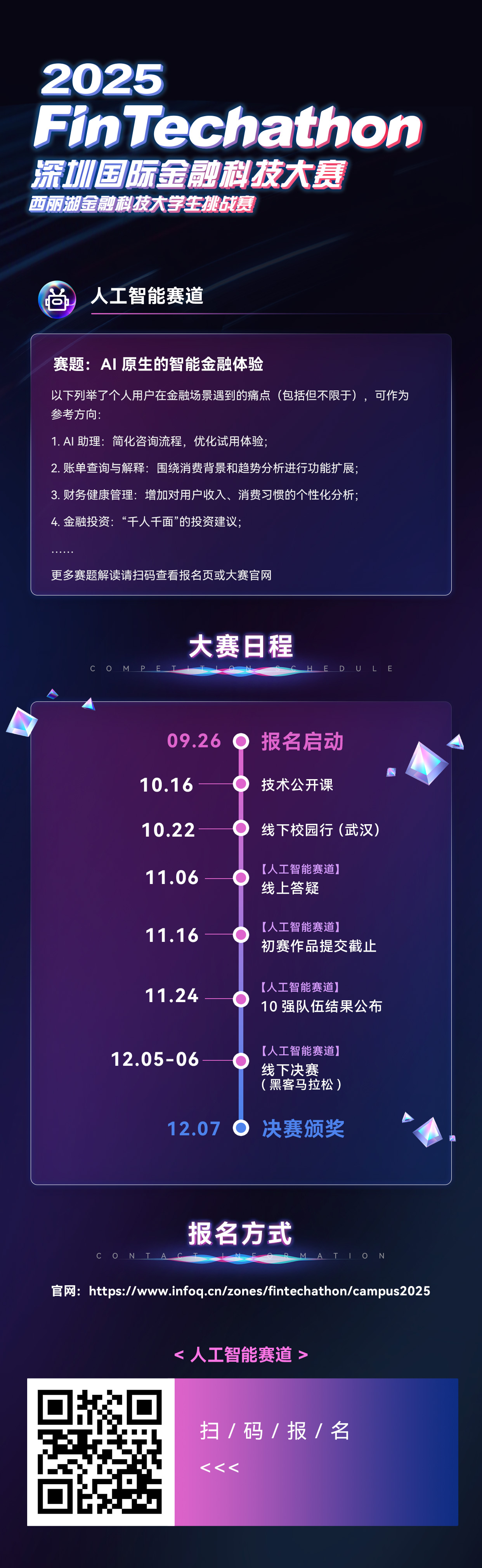 2025 年余额已不足 100 天,该为自己的未来投资了。9 月 26 日起,大赛正式开启报名通道,国内外高校在读生(含本科生、硕士 / 博士研究生)均可报名参赛(图末见报名二维码,也可直接访问大赛官网:FinTechathon | 深圳国际金融科技大赛)。