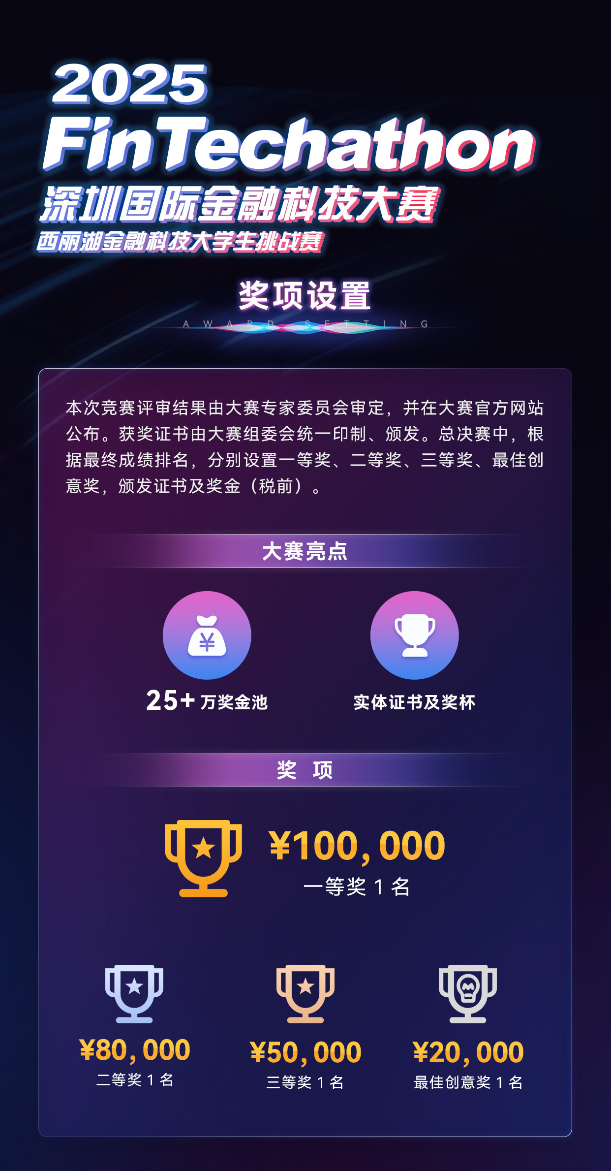 大赛奖金丰厚,两个赛道共有 50 万元奖金,其中人工智能赛道将遴选出 10 支队伍进入决赛角逐,该赛道设置总额 25 万人民币的赛事奖金及参赛专属实体证书及奖杯,以奖励获得一等奖、二等奖、三等奖、最佳创意奖的队伍及成员,参加人工智能赛道前十强选手优先获得直通微众银行秋招面试机会。保障参赛学生既能获得精神奖励,也能获得物质奖励,不画饼,不 PUA,有钱途。