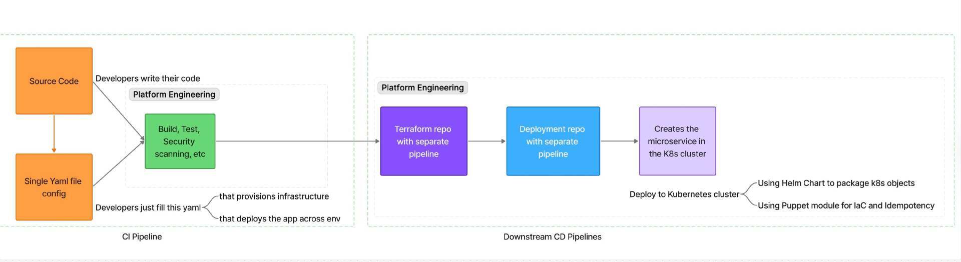 在幕后,平台框架会读取这份配置,并协调 CI/CD 流水线、基础设施自动化以及 Kubernetes 部署等各个环节的实际执行。对开发者来说,交互方式始终是清晰且可预期的;而对组织而言,交付过程则变得一致、可审查,并且能够内建合规与策略约束。