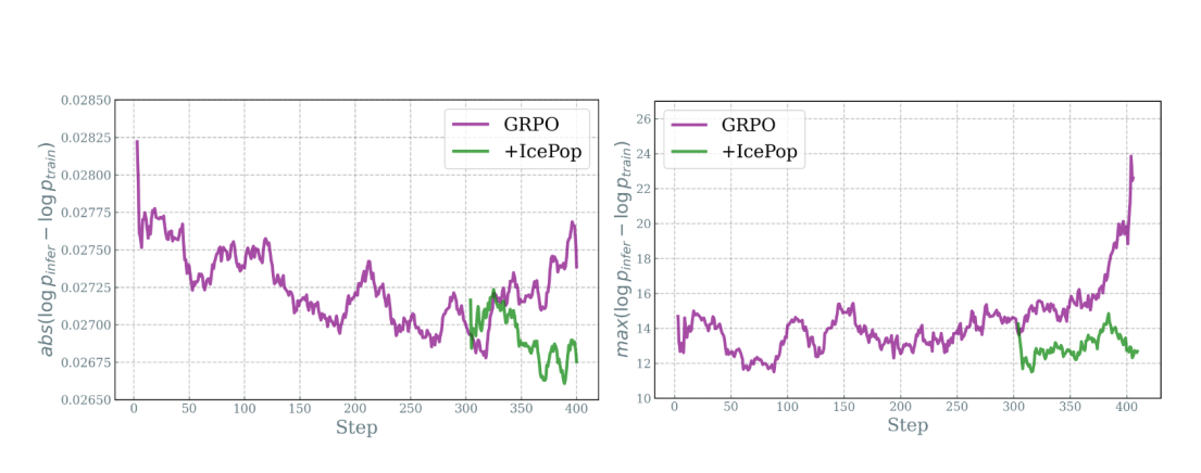 (图左:GRPO 训推差异随着训练成指数上升,icepop 较为平稳;图右:训推差异最大值,GRPO 随着训练上升非常明显,icepop 维持在较低水位)