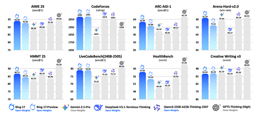 (Ring-1T 与业界代表性思考模型的性能横评)
