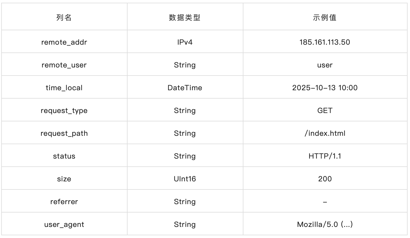 要实现 170 倍压缩,第一步是将原始的纯文本 Nginx 日志转换为结构化格式。我们将日志中的关键信息(如 IP 地址、请求方法、URL、状态码、用户代理等)提取出来,分别存储在独立的字段中。