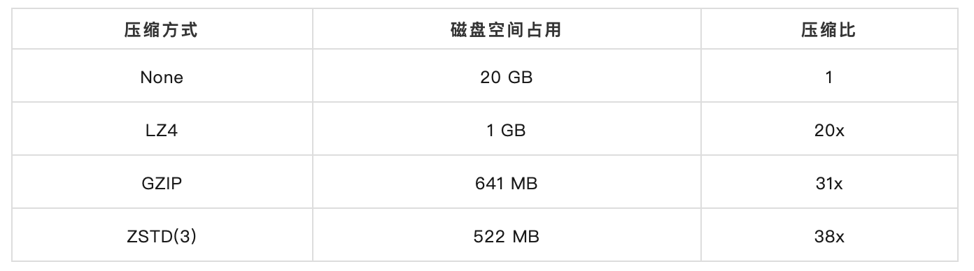 我们将原始日志文件分别用 GZIP、ZSTD(3) 和 LZ4 进行了压缩,比较它们的磁盘存储效果。可以看到,压缩效果相当显著,ZSTD(3) 已经可以实现约 38 倍的压缩比。