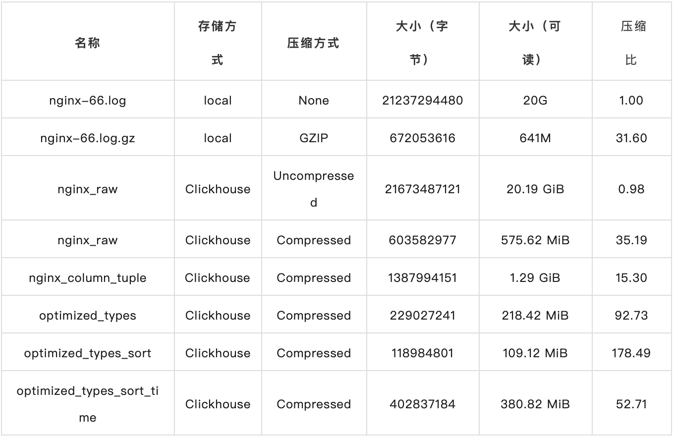 ┌─table─────┬─uncompressed_size─┬─compressed_size─┐ │ nginx_raw │ 20.19 GiB │ 575.62 MiB │ └───────────┴───────────────────┴─────────────────┘
