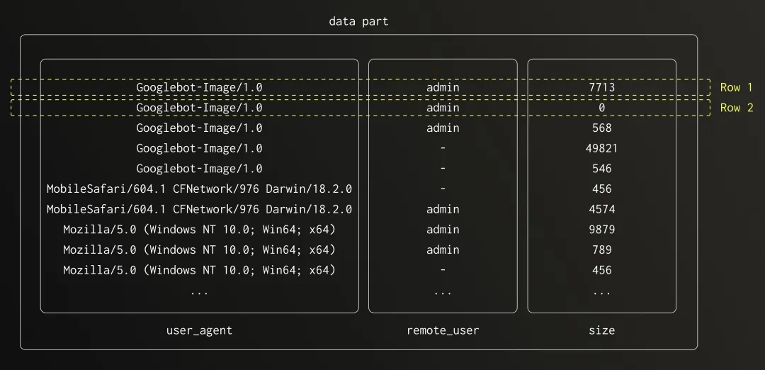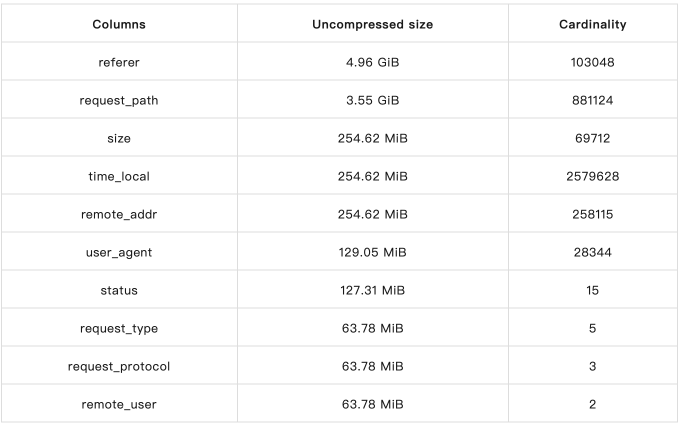 ┌─name─────────────┬─compressed_size─┬─uncompressed_size─┐ 1. │ referer │ 13.69 MiB │ 4.96 GiB │ 2. │ request_path │ 127.19 MiB │ 3.55 GiB │ 3. │ size │ 39.37 MiB │ 254.62 MiB │ 4. │ time_local │ 22.58 MiB │ 254.62 MiB │ 5. │ remote_addr │ 10.76 MiB │ 254.62 MiB │ 6. │ user_agent │ 589.91 KiB │ 129.05 MiB │ 7. │ status │ 3.42 MiB │ 127.31 MiB │ 8. │ request_type │ 722.43 KiB │ 63.78 MiB │ 9. │ request_protocol │ 62.79 KiB │ 63.78 MiB │10. │ remote_user │ 56.81 KiB │ 63.78 MiB │ └──────────────────┴─────────────────┴───────────────────┘