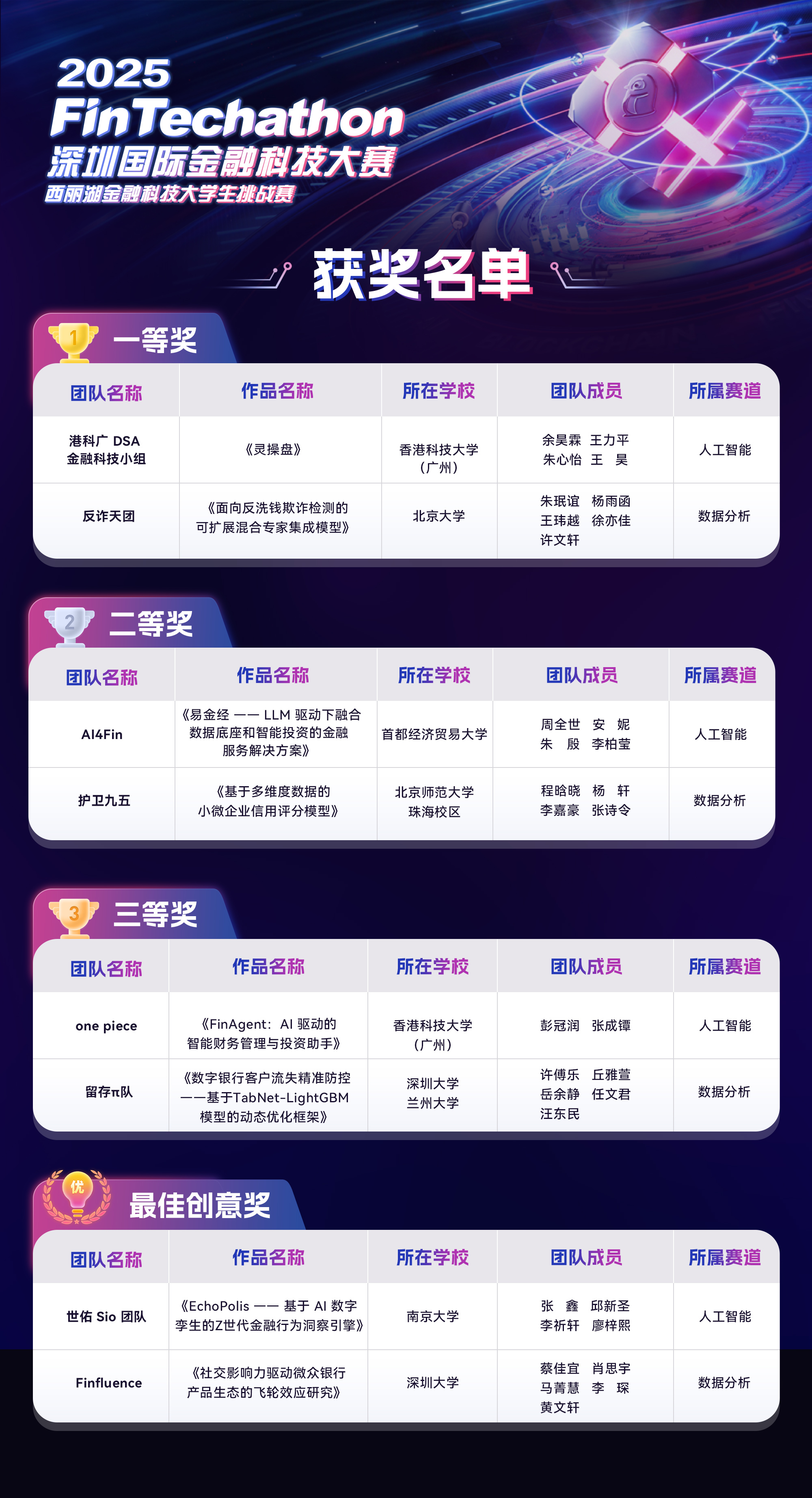 12 月 5 日-7 日,由深圳市地方金融管理局进行战略指导,深圳大学微众银行金融科技学院、微众银行、InfoQ 极客传媒、狗熊会等多方联合举办的 2025 FinTechathon 深圳国际金融科技大赛——西丽湖金融科技大学生挑战赛(以下简称“大赛”)在深圳圆满收官。作为连续七年举办的高规格青年赛事,本届大赛再次有效衔接高校创新成果与真实金融场景,持续发挥产教融合的桥梁作用。