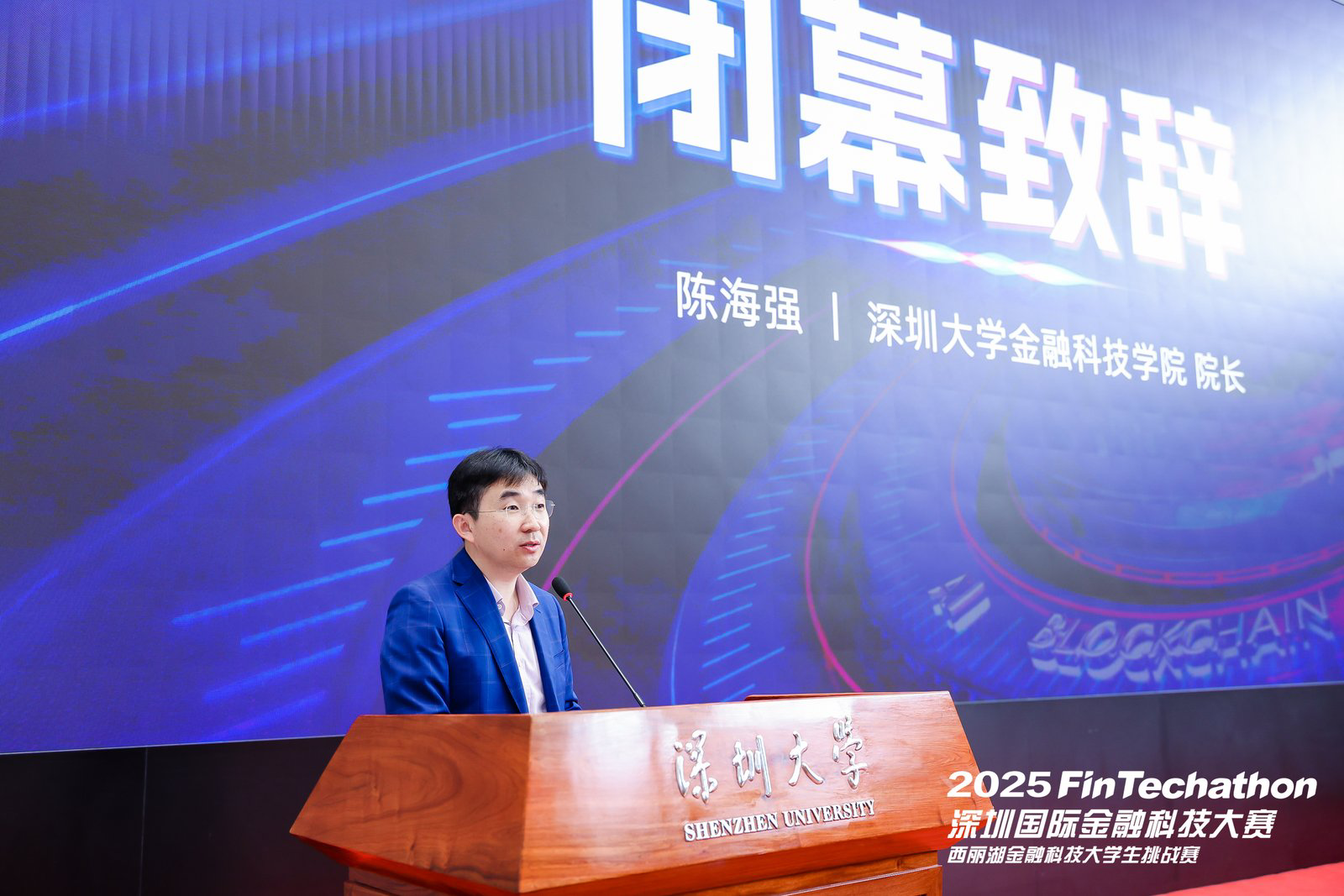 颁奖典礼尾声,深圳大学金融科技学院院长陈海强发表闭幕致辞。他表示,见证大赛圆满收官,既欣慰于亮眼的竞赛成果,更振奋于青年一代对金融科技的深刻诠释与创新实践。“金融科技的未来,不在实验室的图纸上,而在青年一代的实践中。” 陈院长最后寄语全体参赛学子:愿以此次大赛为起点,保持对技术的敬畏之心、对需求的敏锐洞察,让金融科技创新成果真正服务实体经济、惠及万千民众。
