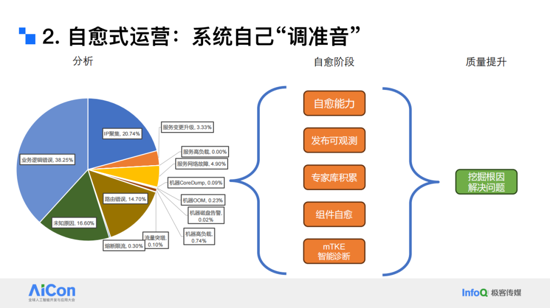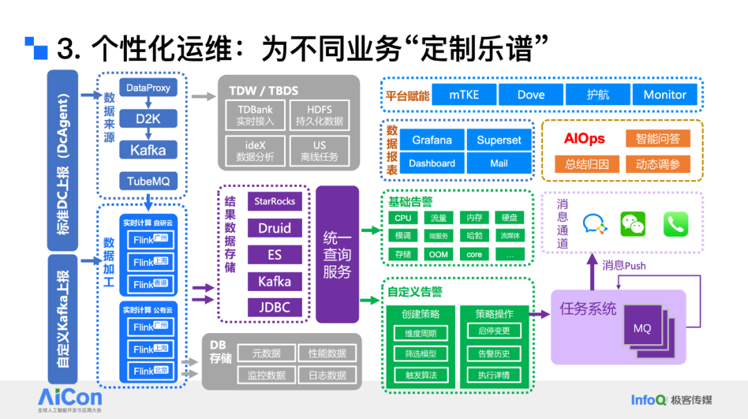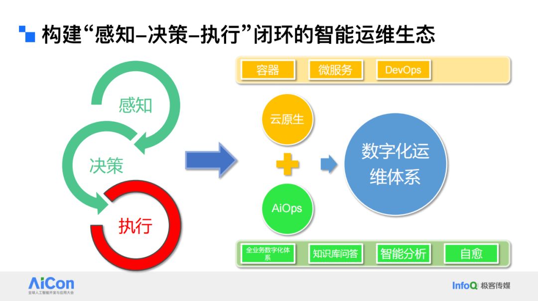最后,集团战略是一体两翼,从内容线到平台线深度融合。同样,我们在建设 AIOps 体系也采用“一体两翼”的战略:以云原生和智能分析为基础,打造更先进、更智能的体系,让 AI 在其中发挥更高价值。