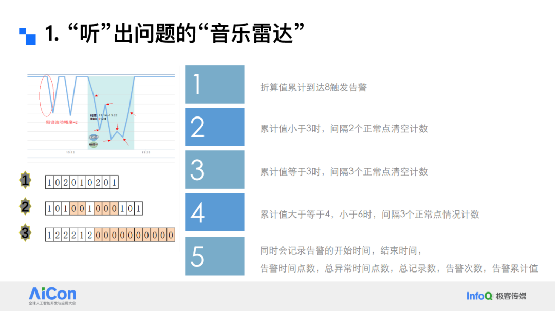 我们也引入了同比和环比等指标,生成相对基准值,并结合波动幅度和深度来判定是否需要触发告警。在此基础上,我们进一步制定策略:当波动幅度达到一定深度时,能够更快地帮助业务发现问题;当波动恢复平稳并持续一段时间时,则判定业务已恢复正常;若处于抖动期,则将深度重置为 0,再重新判断是否需要告警。