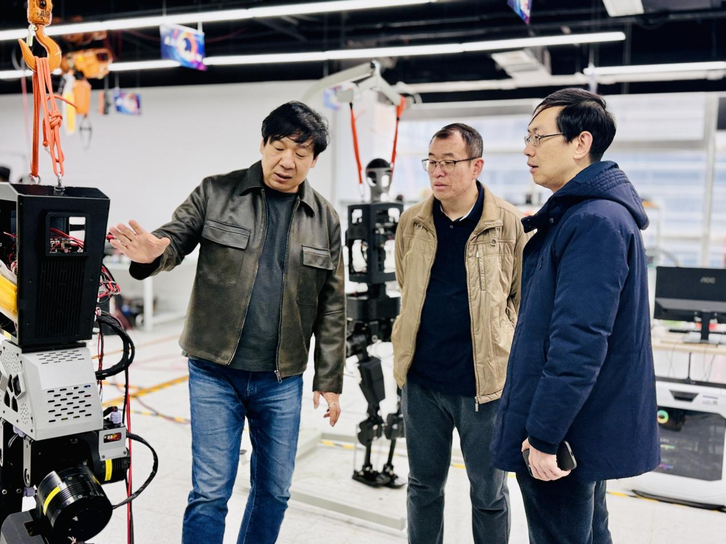 图为:西湖机器人创始团队,从左至右:杜海涛、王东林教授、张岳教授