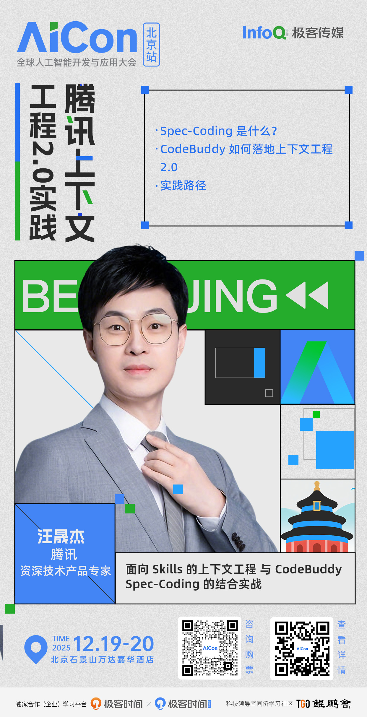 腾讯资深技术产品专家汪晟杰已确认出席并将在「Context Engineering」专题发表题为《面向 Skills 的上下文工程 与 CodeBuddy Spec-Coding 的结合实战》的主题分享。在信息化快速迭代的背景下,企业级开发普遍面临需求频繁变更、协作断层、效率低下等问题。