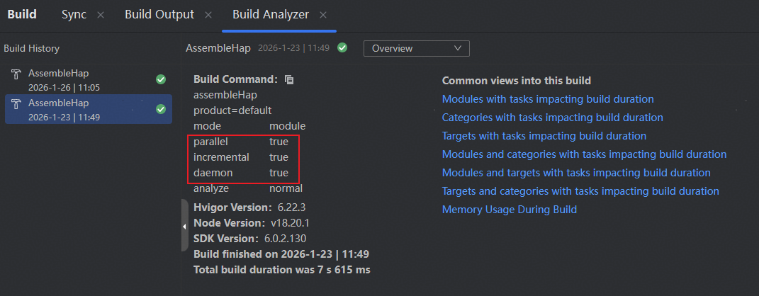 DevEco Studio 提供了增量构建、并行构建等能力来提升构建效率,减少构建耗时。这些构建配置默认是开启的,开发者可以通过 Build Analyzer 工具,查看并行(parallel)、增量(incremental)、守护进程(daemon)的开启情况,建议配置为 true,以提升构建效率。