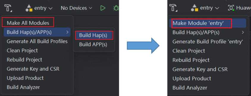 如果需要对某个模块进行开发调试,应避免使用“Make All Modules”,应该使用“Make Module‘***’”,这样避免编译过程中对所有模块启动编译打包任务,进而导致编译耗时变长。当工程下有多个 Hap 模块(entry 或 feature),如果只对某一个 Hap 进行开发调试,也不建议直接使用 “Build Hap(s)”进行构建,这会对所有的 Hap 模块进行构建,同样会带来较长的编译耗时。这种情况下建议开发者使用“Make Module‘***’”进行构建,仅构建关注的模块,提高开发效率。