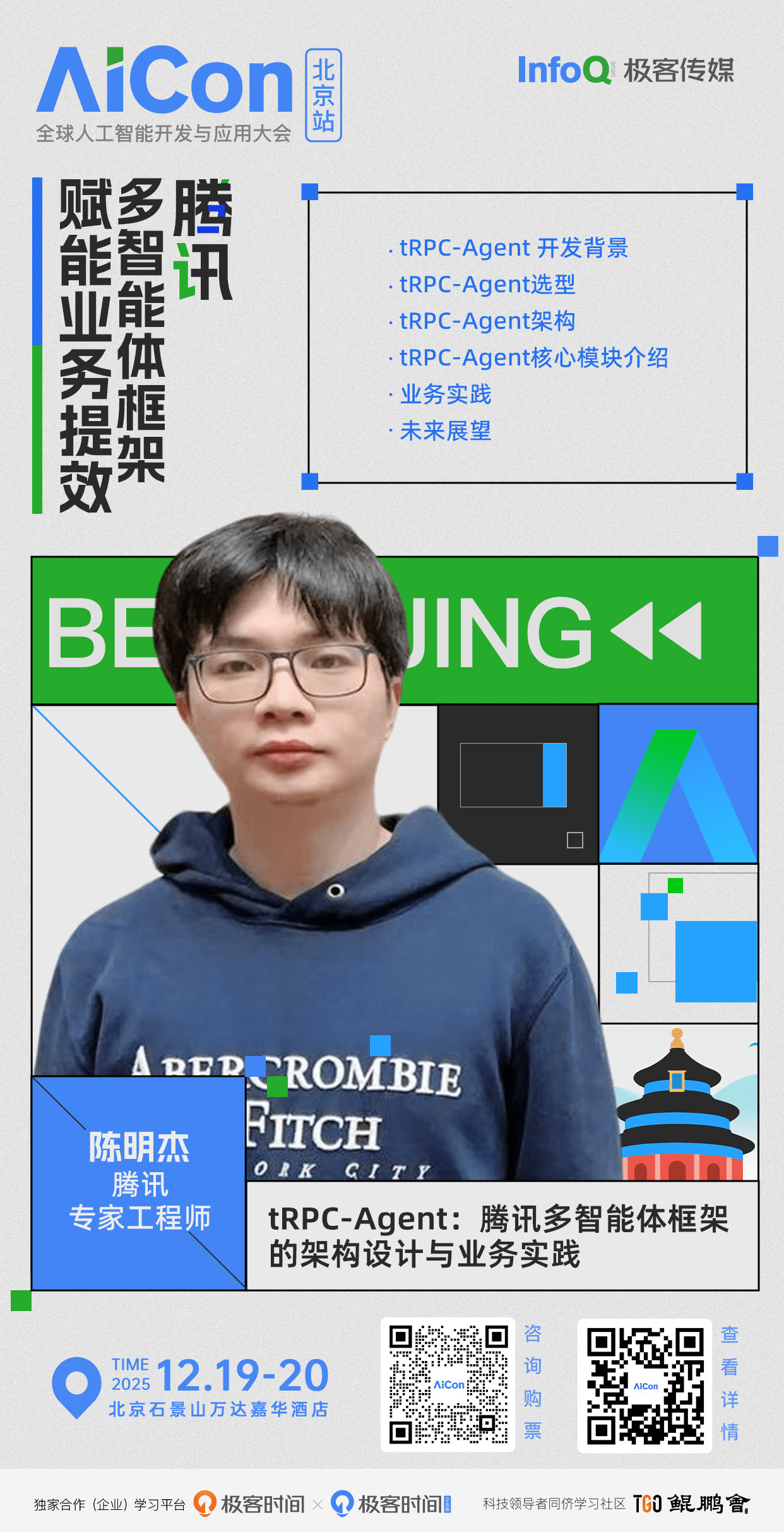 腾讯专家工程师陈明杰已确认出席并将在「大模型系统工程」专题发表题为《tRPC-Agent:腾讯多智能体框架的架构设计与业务实践》的主题分享。基于腾讯内部海量微服务对智能 AI 应用的迫切需求,tRPC-Agent 框架应运而生。当前业务场景不仅需要稳定的工作流编排,更亟需具备自主决策与多智能体协作能力的 AI 系统,以应对复杂多变的真实业务环境。