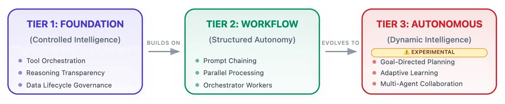 基础层建立工具编排、推理透明度和数据生命周期模式,以建立组织信任。工作流层通过五个核心模式提供自动化:提示链、路由、并行化、评估器-优化器和编排器-工作者。自主层使 Agent 能够动态确定自己的方法和工具使用。