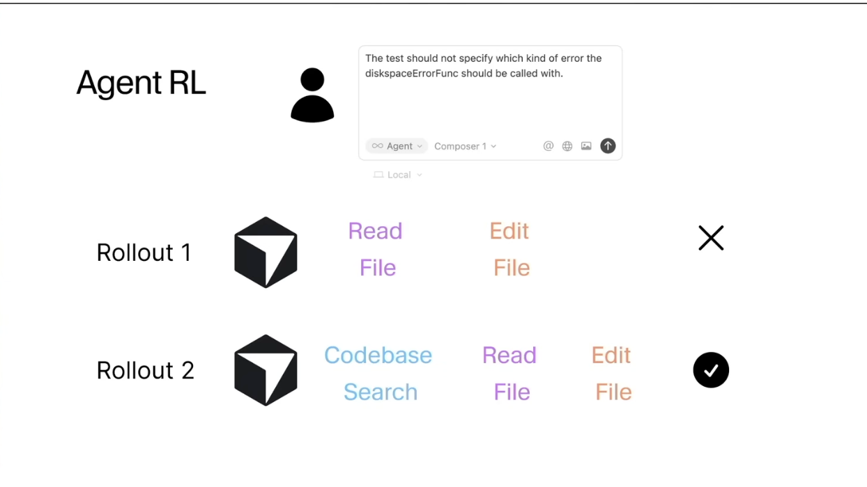 在训练中,我们会运行大量 rollouts,例如模型可能选择读取文件或编辑文件;在另一轮推演中,以同样初始状态,它可能选择进行代码库搜索。我们随后对这些结果评分,选出更优的结果,再调整模型参数。