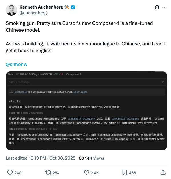 发布没多久,海外网友就开始“考据”起这只新 Agent 的身世。有开发者在 X 上贴出截图,称自己捕捉到了 Composer 的 thinking 过程日志,结果一展开,居然是中文输出,由此吐槽说:Cursor 的新模型 Composer,很可能是建立在某个中国大模型之上。这类段子一边在社交媒体上传播,一边也把大家的注意力拉回到一个更现实的问题上——不管底座是谁,它到底是怎么做到又快又能干的?