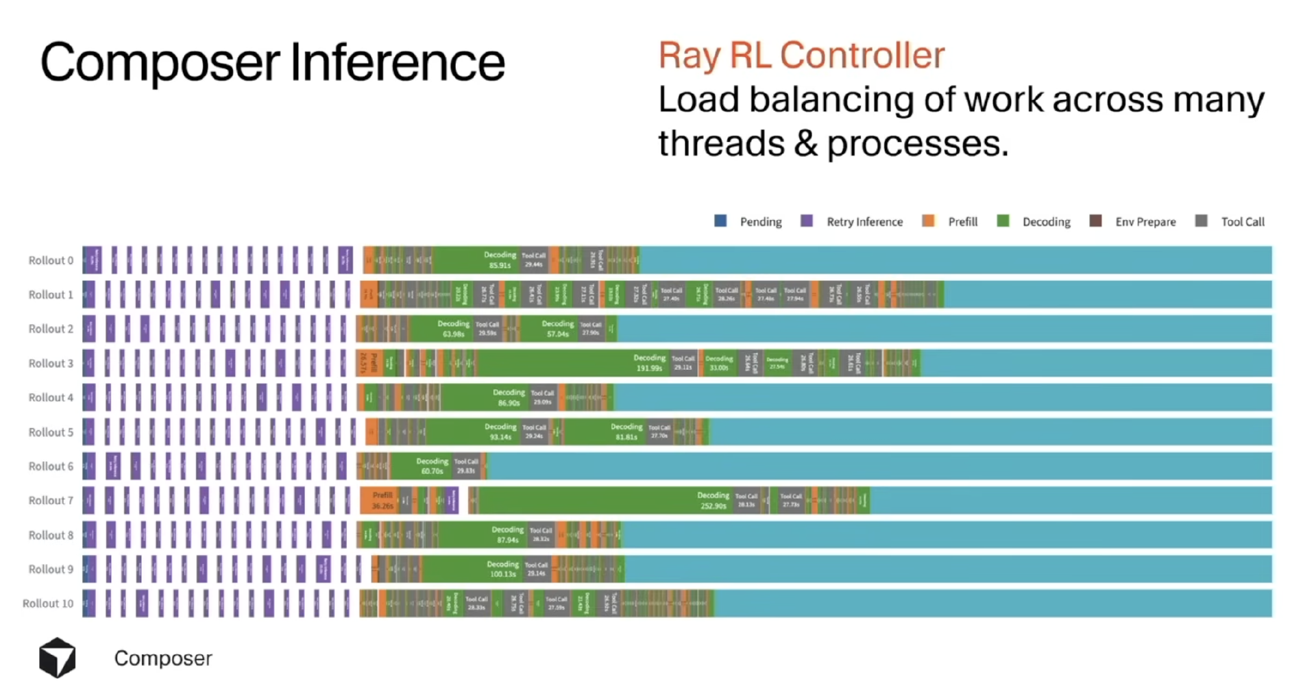 第三,一致性问题。为了贴近生产环境,我们必须使用与真实 Cursor 完全一致的工具格式与工具返回结果。但训练阶段的计算负载极其集中、呈爆发式,与生产环境分布式、平稳的请求模式差异巨大,这带来了巨大的基础设施挑战。