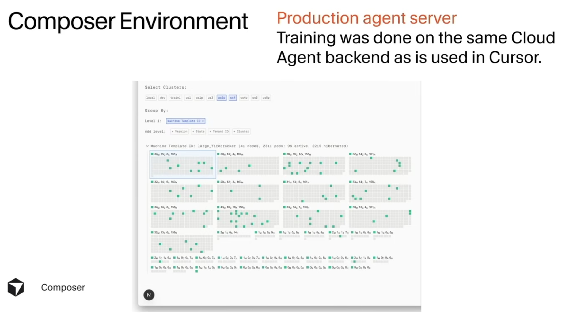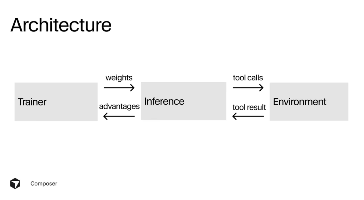 我们主要使用三类服务器:推理服务器、运行标准 PyTorch 机器学习栈的训练服务器,以及用于模拟我之前提到的 Cursor 环境的环境服务器。这三类服务器彼此通信,例如推理服务器会将优势函数传回训练端,根据 rollout 的反馈 nudging 模型参数,并更新权重。