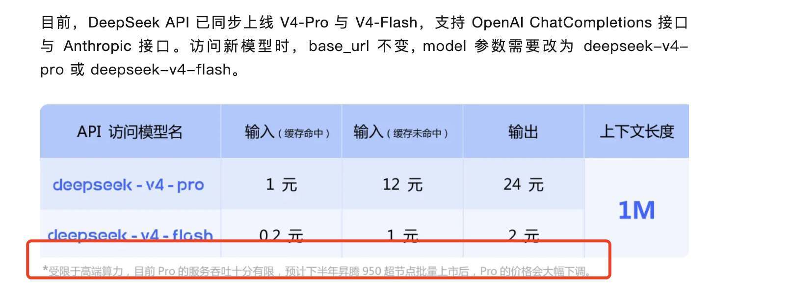 在工程层面,DeepSeek 还在 DeepGEMM 中开源了一个 Mega-Kernel,宣称支持 NVIDIA GPU 和华为 Ascend NPU。可以看出,他们的目标之一,是未来在 Ascend 上承载一部分推理流量。官方 API 页面还提到,受限于高端算力,目前 V4-Pro 的服务吞吐仍有限,预计下半年昇腾 950 超节点批量上市后,Pro 价格会大幅下调。