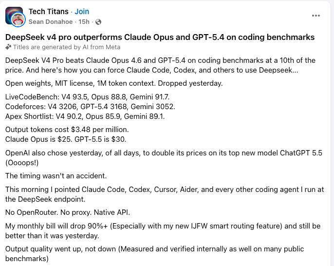 “DeepSeek V4 Pro 在编码基准测试中击败了 Claude Opus 4.6 和 GPT-5.4......今天早上,我把 Claude Code、Codex、Cursor、Aider,以及我用的所有其他编程智能体全部指向了 DeepSeek 端点。不用 OpenRouter,不用代理,原生 API。我的月账单将下降 90% 以上,而且效果比昨天还好。”