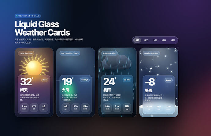 “你是 Apple Inc 的顶级 UI 设计师,以 iOS 18 的设计风格(毛玻璃效果、高斯模糊、动态渐变、细腻阴影)创建一个单个 HTML 文件。实现横板天气页面,包含 4 个并排的动画天气卡片:晴天(太阳光线、动态光晕)、大风(飘动云朵、摇曳树木、风线)、暴雨(下落雨滴、形成水洼、闪电)、暴雪(下落雪花、堆积效果)。卡片需深色背景,支持按钮切换天气状态,实现流畅交互和微动效。代码必须可直接运行,美观度优先。”