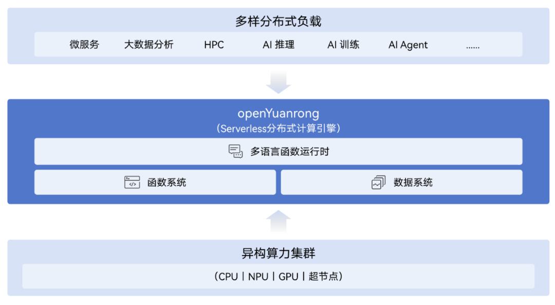 Serverless 计算以其单机体验编程、自动弹性扩缩、免运维、和屏蔽复杂基础设施等优点广受业界关注,但传统的 Serverless 产品(以 FaaS 为代表)大多是面向特定垂直领域定制、缺乏通用性。因此,面对复杂的应用,往往需要和现有微服务(容器)集群混合部署。如此便会造成多个基于异构软件技术栈的异构集群之间的互操作效率低下、集成和管理复杂。不仅如此,随着 AI 技术的普及,以及 AI Agent 新应用的兴起,通算和智算集群之间也需要相互集成,当前的各个集群软件之间缺乏协同,也带来开发运维复杂、集群资源割裂、跨系统数据流转开销大等严重问题。而 openYuanrong 则致力于以统一的 Serverless 技术栈支持上述各类通算和智算负载在统一资源池上的细粒度融合部署,实现各负载间的高效协同和资源复用,同时提高系统性能,提升计算资源的使用效率。