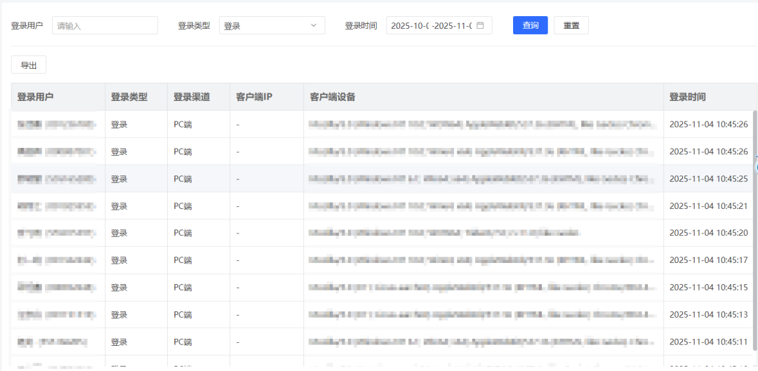 登录日志模块可精确记录用户身份认证过程,包括登录时间、终端设备、IP 地址等关键信息,确保身份真实性可验证。操作日志实时捕获用户在系统中的关键行为,涵盖菜单访问、功能操作、数据修改等动作。请求日志则对 API 级数据流动进行深度追踪,记录请求参数、响应状态、数据流向等交互细节,实现从界面操作到底层数据交换的全栈监控。