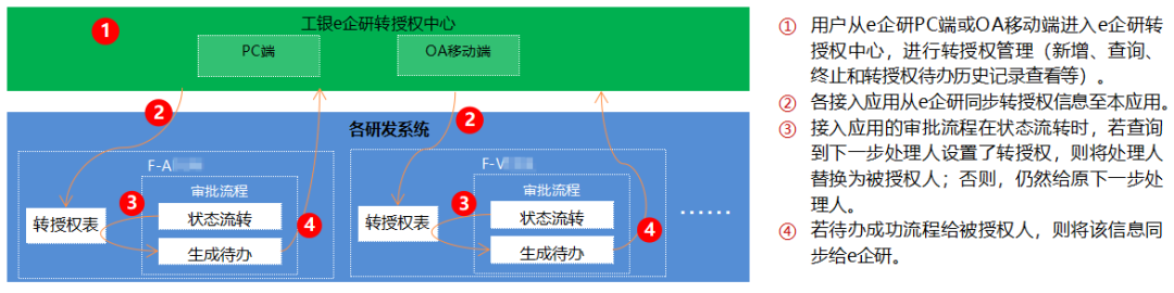 在 PC 端和移动端工银 e 企研入口建设转授权中心,实现转授权信息的新增、查询、终止、通知和历史记录查看等功能,研发领域所有涉及审批的流程接入工银 e 企研的转授权中心,实现按功能和角色一键转授权。