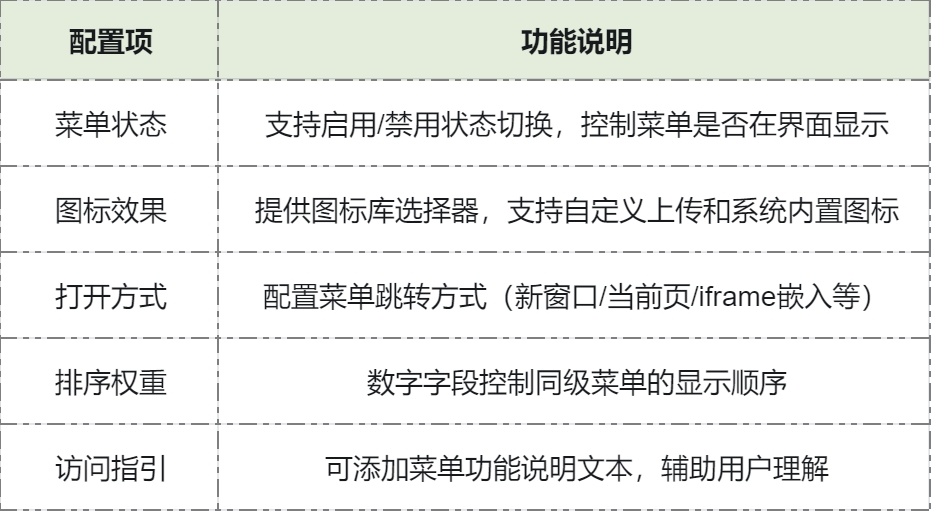 菜单权限管理采用全场景配置化设计,实现了菜单的动态注册、上线和下线功能,无需编码即可完成权限配置流程。系统支持机构、部门、角色及用户四个维度的权限控制体系,通过分层级授权机制确保菜单及数据的安全性。该模块提供了完整的菜单信息维护功能,包含菜单状态、图标效果、打开方式、指引等个性化配置字段,管理员可通过可视化界面灵活调整菜单展示效果和权限设置。