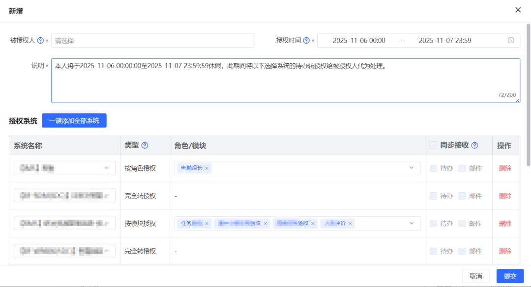 (2)灵活授权,满足多样需求:支持多种授权模式,用户可根据实际情况灵活选择。系统提供按功能授权和按角色授权两种核心方式:按功能授权可精准指定特定业务的所有工作流程全权委托,实现业务维度的完整权限转移;按角色授权则能精准将指定角色的审批流程进行授权,并支持设置特定时间段的授权范围,满足临时性工作交接需求。这两种授权模式通过可视化界面实现,用户只需简单操作即可完成复杂权限配置。