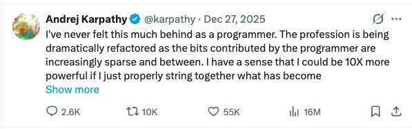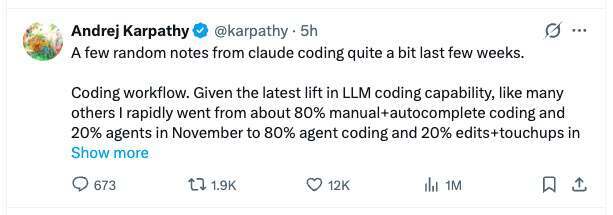 到了今天,Karpathy 状态已经明显不一样:不再是“我跟不上”了,而是“我已经换了一种编程方式”。