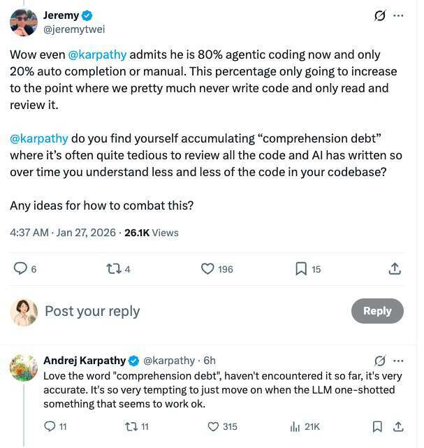 这也势必会积累起“理解债”:因为审查 AI 写出来的代码太费劲,人会越来越倾向于“能跑就先过”,时间久了反而会对自己的代码库理解得越来越少。Karpathy 在评论中表示,他很喜欢“理解债务”这个词,虽然之前没见过,但觉得非常贴切;而且他也承认,这种诱惑确实存在——当 LLM 一次就把问题解决、而且看起来运行得还不错时,人真的很容易就想直接往下走。