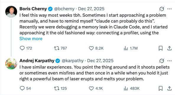 Karpathy 则在评论里加了一个比喻:就像你拿着“激光枪”到处指,有时只打出一堆小弹丸,有时甚至会哑火;但偶尔,当你握对了姿势,一束强力激光会突然喷涌而出,直接把你的问题“熔掉”。