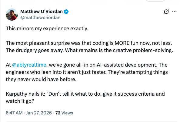 他引用 Karpathy 的一句话总结这种变化:“不要告诉它怎么做,给它成功标准,然后看它自己跑。”