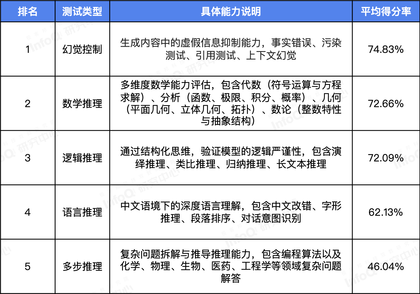 评测围绕逻辑推理、数学推理、语言推理、多步推理以及幻觉控制五大维度展开。300 道题库中包含超过 90%的原创试题,覆盖 3 个难度梯度、涵盖多学科和多题型,并确保评分可量化、难度分层合理。