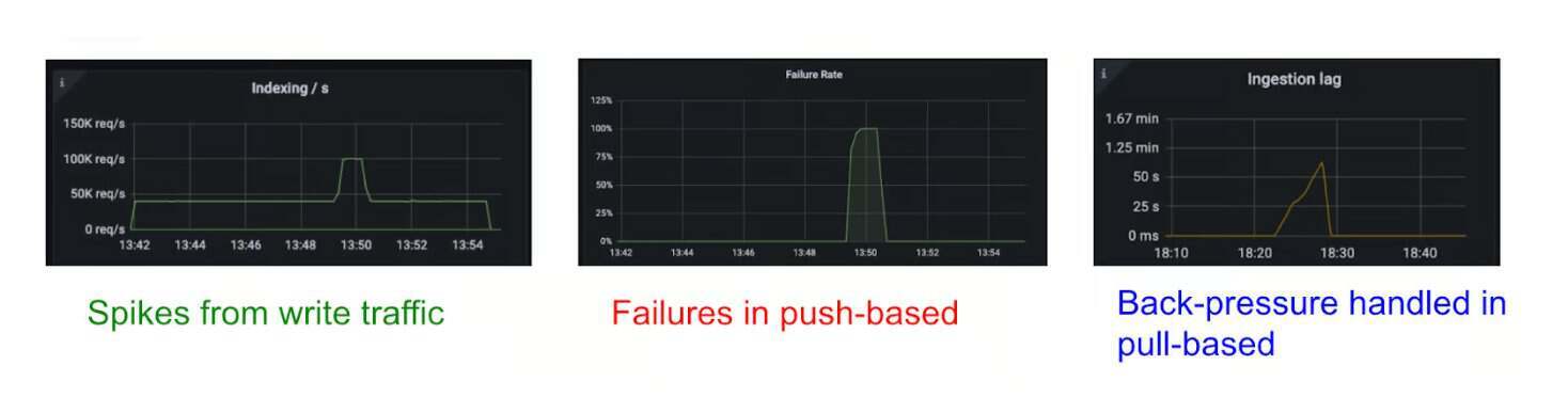 在流量突增期间,推送式和拉取式摄入表现对比(图片来源:优步的技术博客)