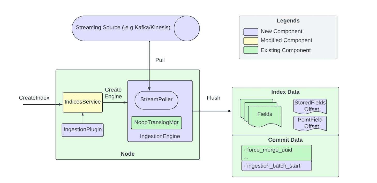 拉取式管道由多个交互组件构成。事件会被写入 Kafka 或 Kinesis 主题,每个分片映射到一个流分区以支持确定性重放;流消费者将消息拉取到阻塞队列,实现消费与处理解耦,并支持并行写入;消息由独立线程完成校验、转换与索引请求准备,再交给摄入引擎;引擎直接写入 Lucene,绕过事务日志(translog),同时跟踪已处理的偏移量以支持确定性恢复。