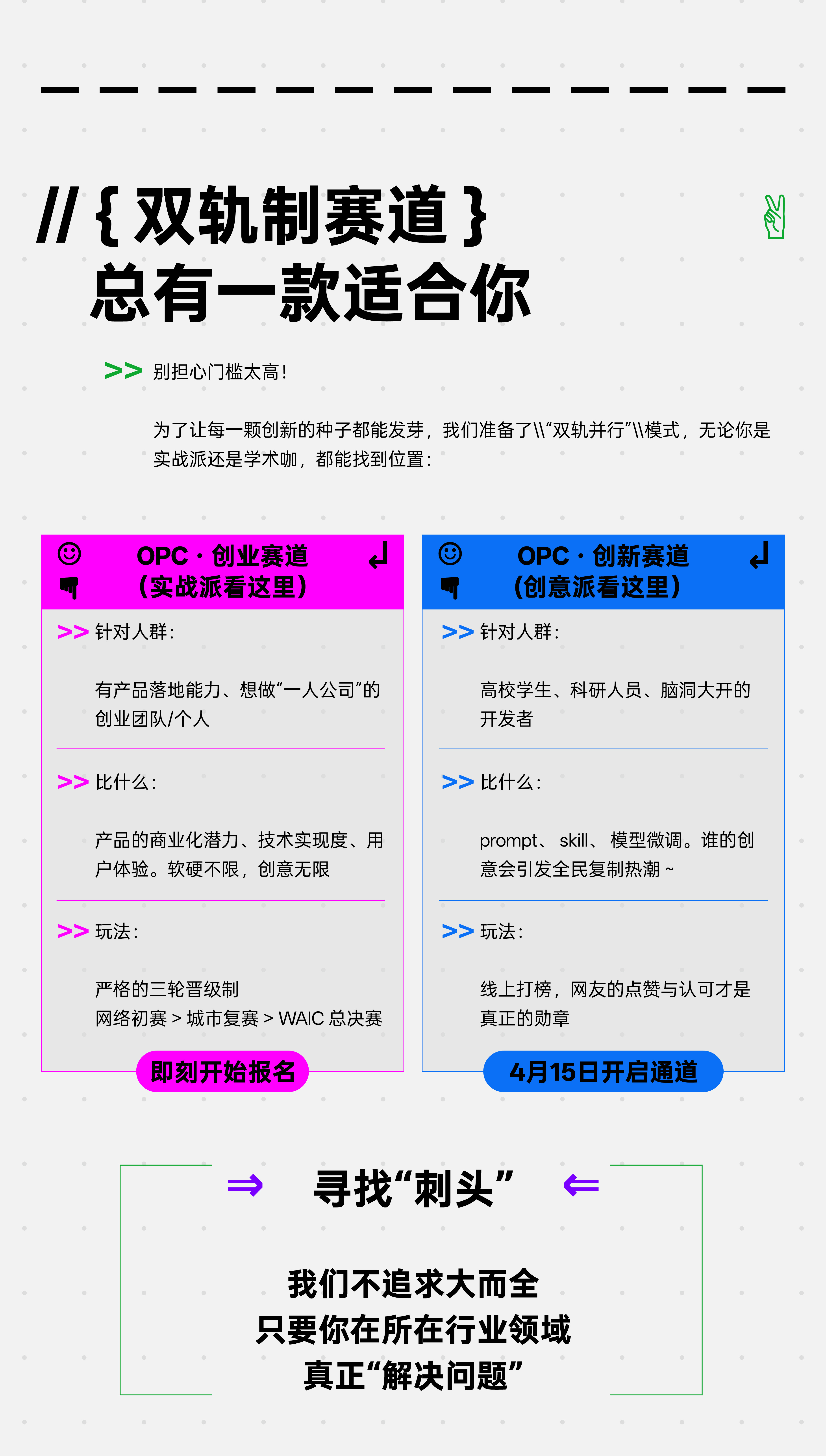 玩法很简单:4 月线上提交 Demo 筛选,5 月城市路演(北京、上海、深圳、成都、新加坡等 10 城联动),7 月进入 WAIC 总决赛。