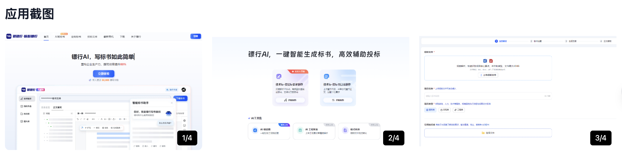 :镖行 AI 标书,标书 AI 智能写作工具。一键智能生成图文并茂高质量标书,高效辅助投标。操作简单,急标、新手友好。