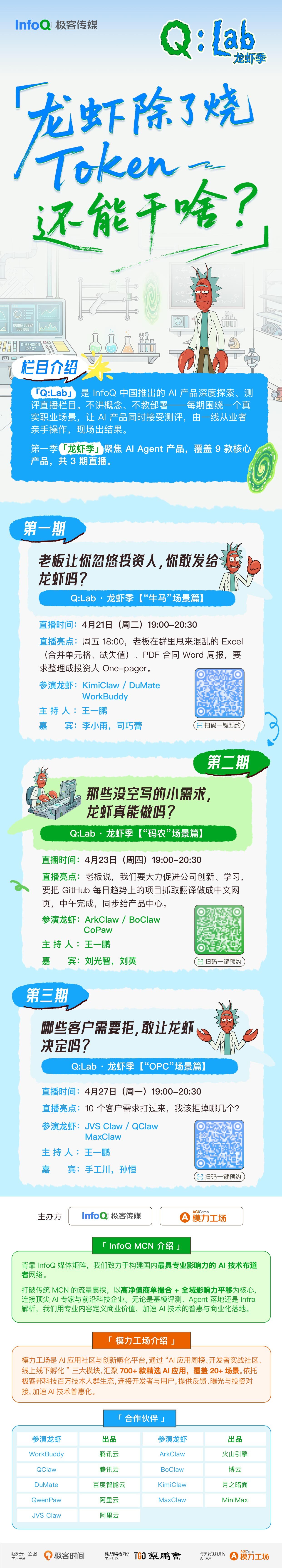 第一季「龙虾季」由模力工场和 InfoQ 共创,聚焦 AI Agent 产品,覆盖 9 款核心产品,共 3 期直播。