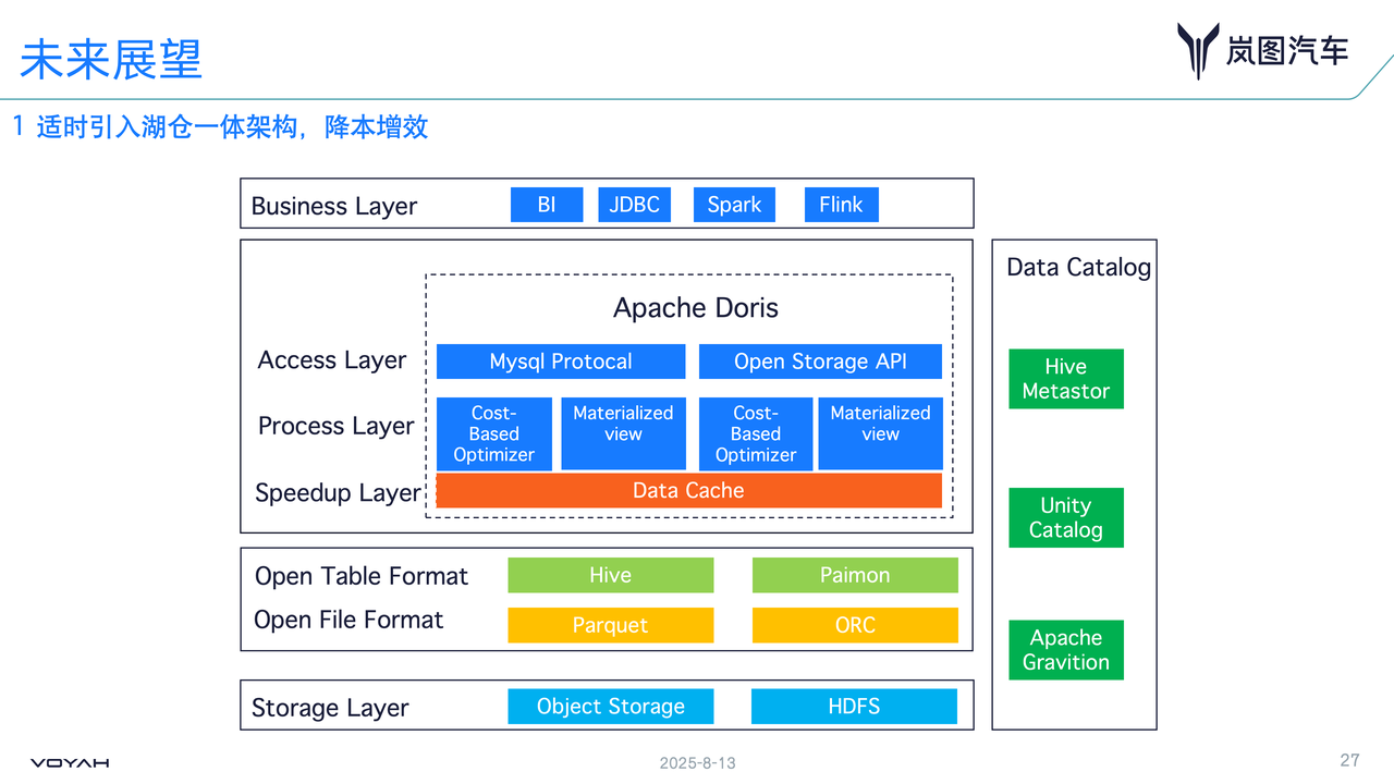 岚图汽车计划适时引入湖仓一体架构到其数据生态系统中。湖仓一体范式将传统数据仓库(性能、治理)的优势与数据湖(存储原始、多样化数据)的灵活性和成本效益相结合 ,目前处于规划和测试阶段。