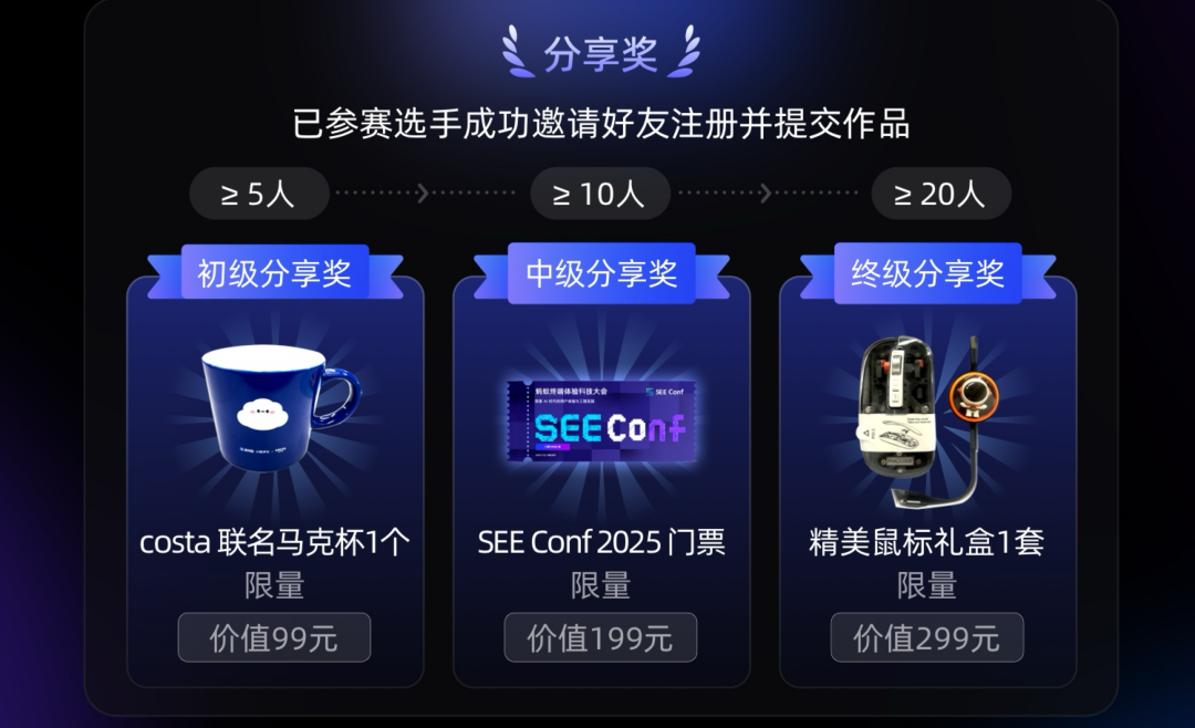 参与本次大赛,成功邀请 10 位好友投稿就能直接获赠 SEE Conf 门票!优秀作品更将直接登上 WeaveFox 首页参与点赞排行,你的创意不仅可能收获千元大奖,更有机会被行业大咖“翻牌”!