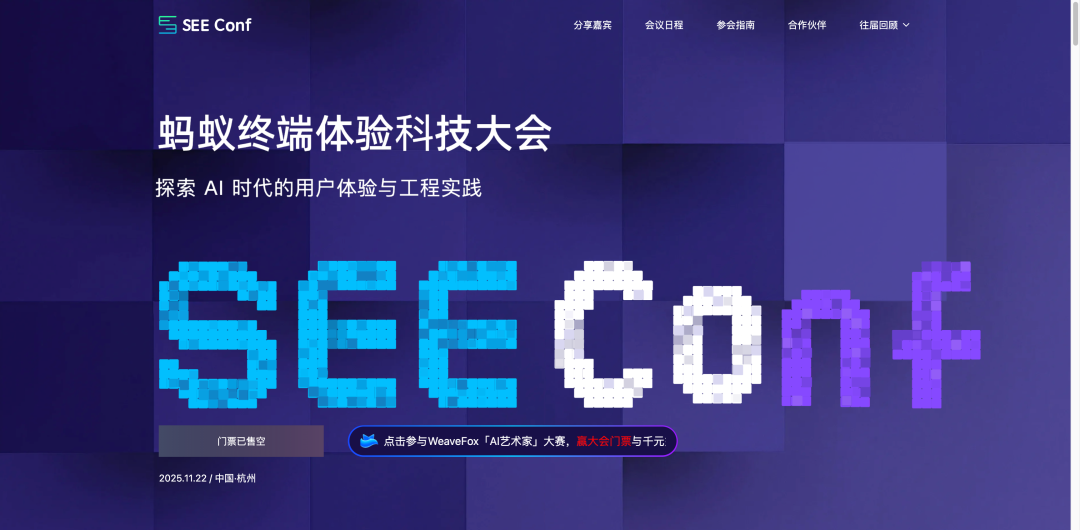 进入大会官网 https://seeconf.antgroup.com/,或登录 WeaveFox 直接投稿到创意大赛 :https://www.weavefox.cn/?ref=seeconf ,立即参与吧!