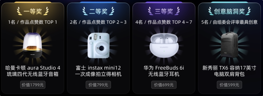 参赛即有机会拿奖,福利拉满!不用担心“陪跑”,你的每一份创意都有价值: