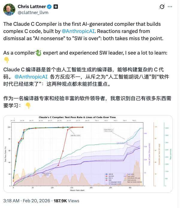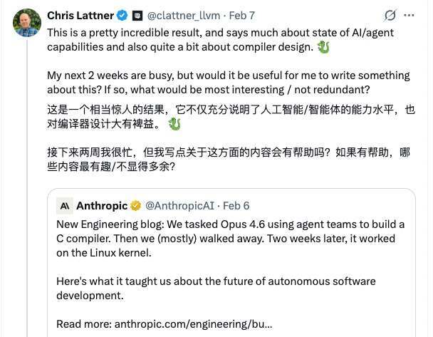 2 月 6 日,Anthropic 发布工程博客:他们让 Opus 4.6 以 agent 团队方式构建一套 C 编译器,“基本放手”两周后,它能在 Linux 内核上工作。2 月 7 日,Lattner 在 X 上转发并评价这一结果“相当惊人”——既反映了 AI/agent 能力的进展,也说明了编译器设计的某些特性。他随即抛出问题:如果由他来写一篇解读,哪些角度最值得写、又不至于重复现有讨论?在大量反馈推动下,他随后深入拆解其工作方式与构建过程,并于 2 月 20 日发表长文总结所见。