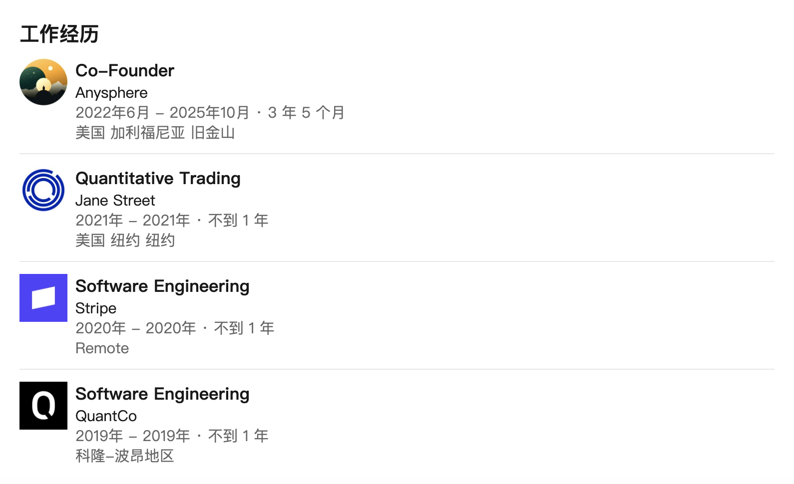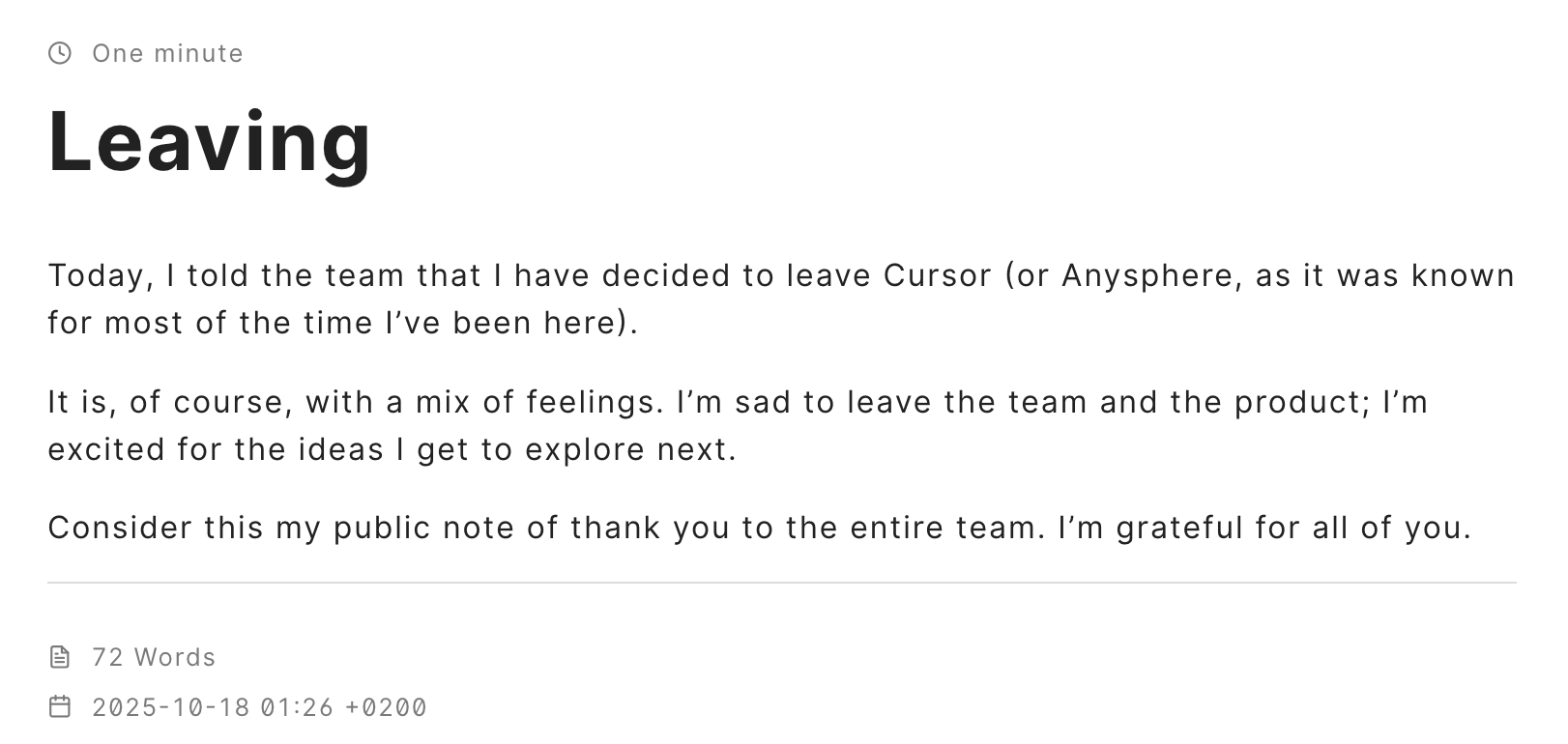 “今天,我告诉团队我决定离开 Cursor(或 Anysphere,因为我在这里的大部分时间都叫它这个名字)。