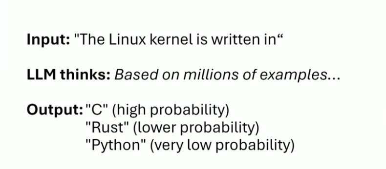 他认为 LLM 本质上就是一个参数规模巨大的模式匹配引擎,可以看作一个“超大的状态机”。不同的是,内核里常见的状态机是确定性的,而 LLM 的状态转移是概率性的。给定一段上下文,它会预测“下一个最可能的词”。比如输入“the Linux kernel is written in...”,它几乎一定会输出 “C”,但也存在较小概率输出 “Rust” 或 “Python”。