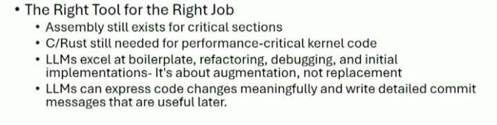 Levin 并不认为 LLM 会取代人类做内核开发。他更愿意把它看作“下一代编译器”。过去开发者写汇编,后来有了高级语言;当时也有人不认可,说“真正的开发者应该自己分配寄存器”。但最终大家还是接受了更高层的工具,生产力也随之提升。LLM 也是类似的演进——它不完美,但已经足够带来效率提升。